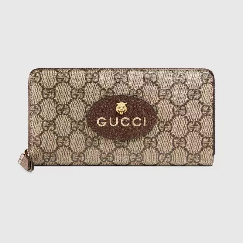 GGスプリームキャンバスを使用したレトロ風のスモールレザーグッズシリーズ。楕円形のレザーサインには、最近の人気を象徴するメタルキャットヘッドが飾られています。フルジッパーウォレットの内側を黄色い革で飾ります。