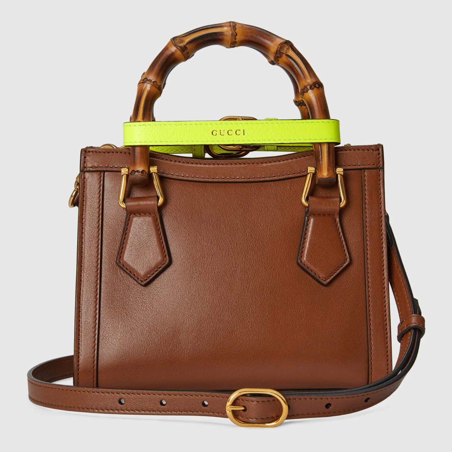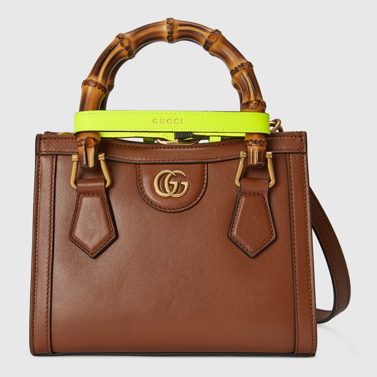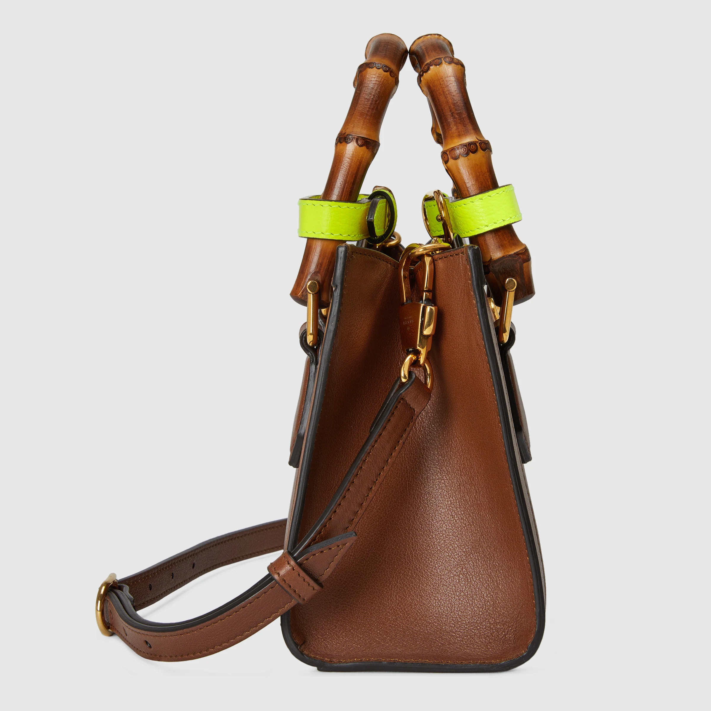 グッチを象徴するさまざまなエレメントを散りばめたミニ トートバッグ。バンブー ハンドルとダブルG ハードウェアがデザインのポイントです。ブラウン レザーで仕立てたバッグに、ネオンカラーのストラップを2本配しました。ハンドルの形を保つためのバンドを模した、遊び心あるディテールです。