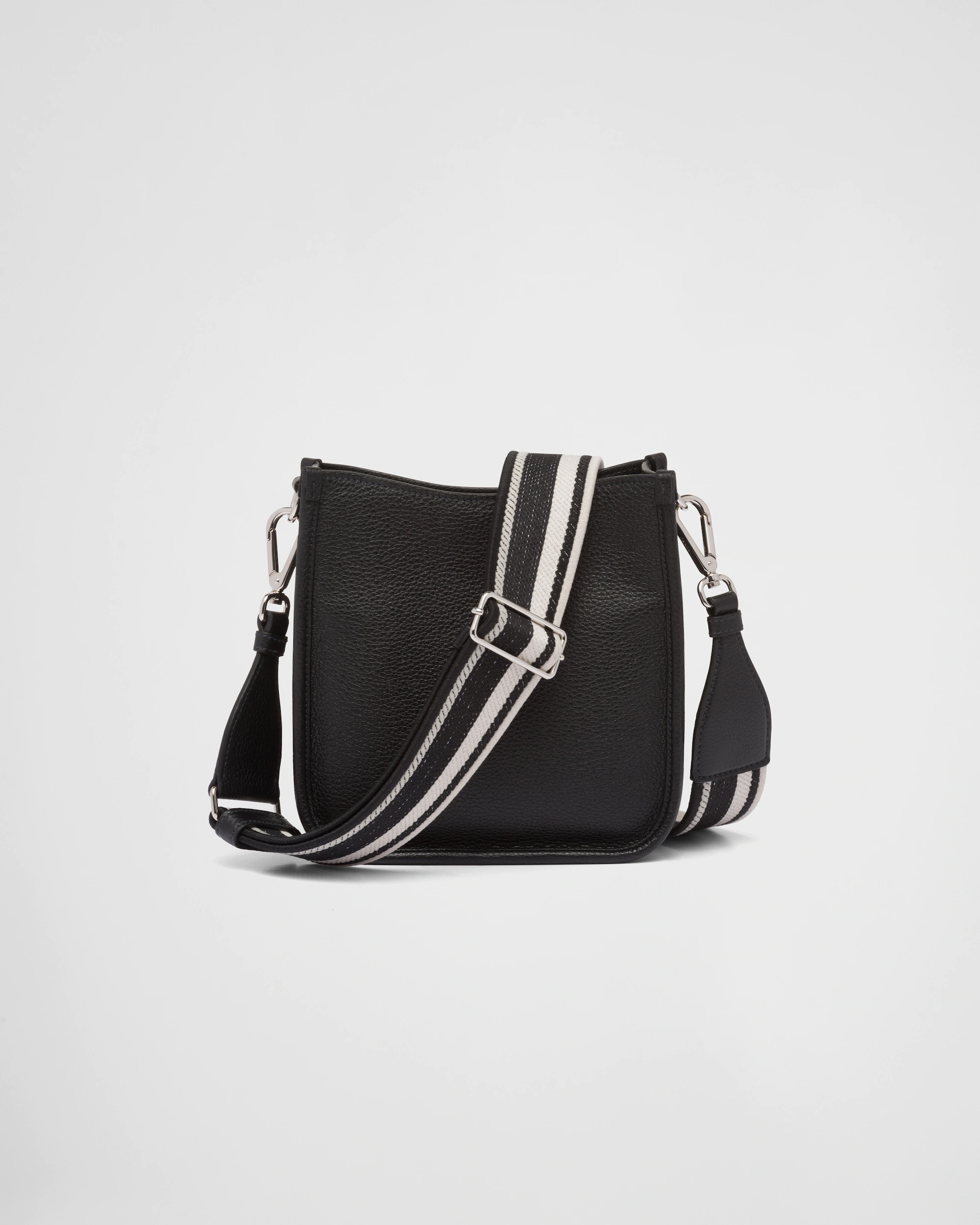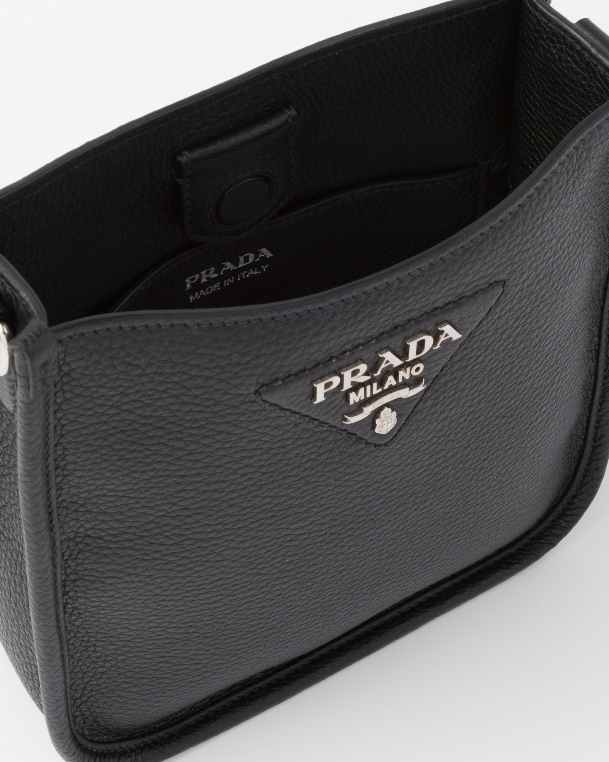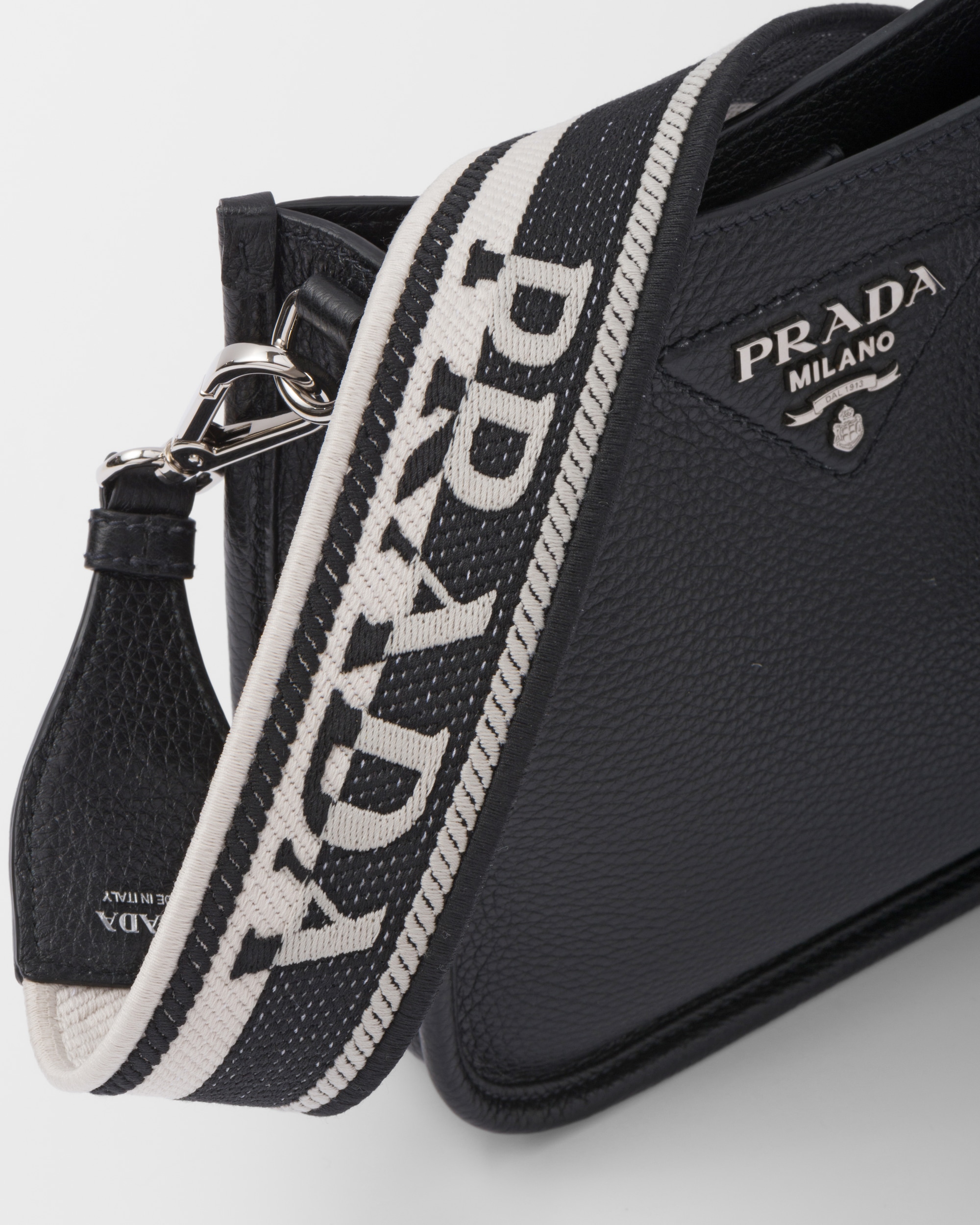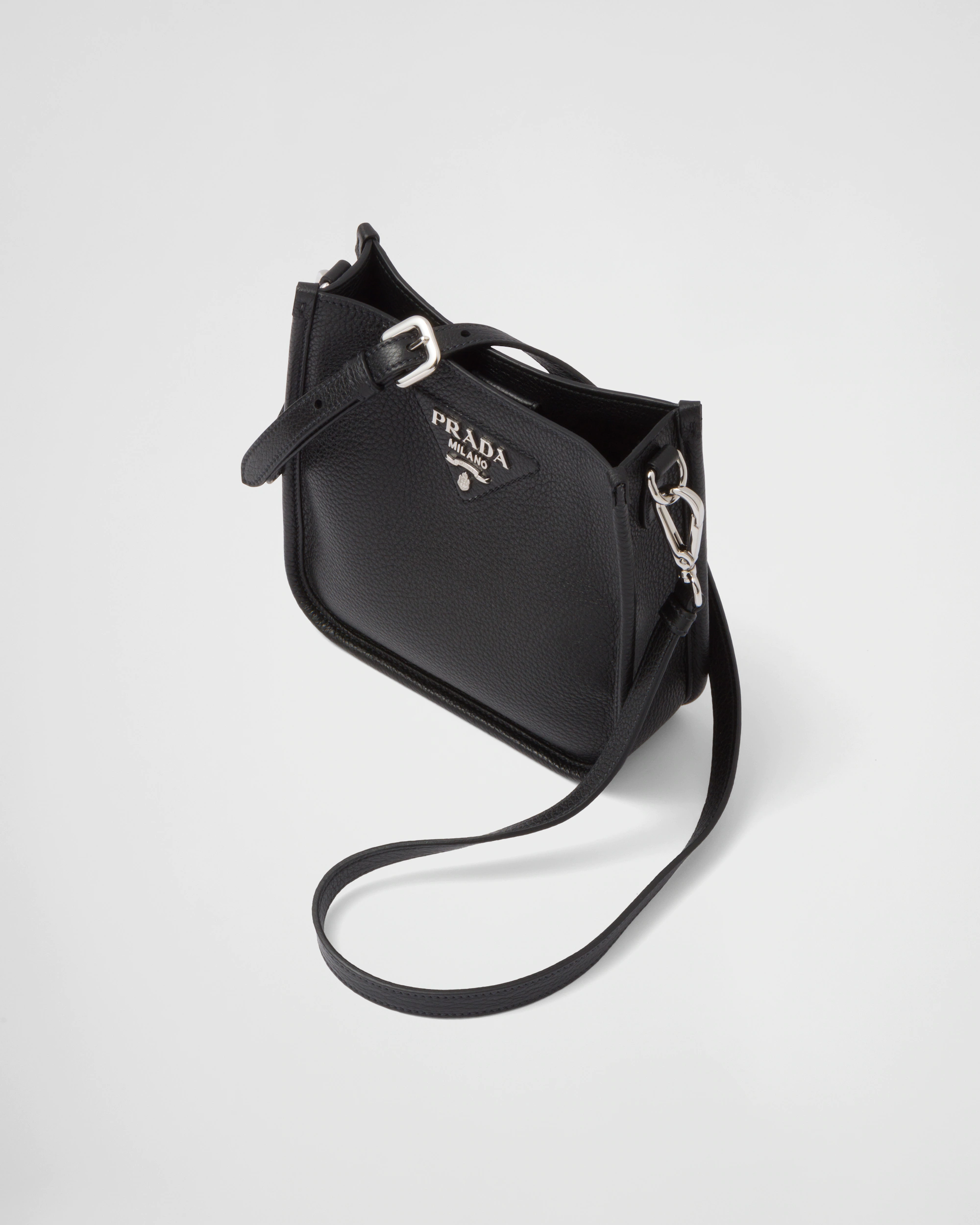 フロントのメタルのトライアングルロゴがアイコニックなアクセントを添える、洗練されたデザインのレザーのミニ ショルダーバッグ。取り外し可能なロゴプリント入り織テープが現代的な印象を引き立てます。